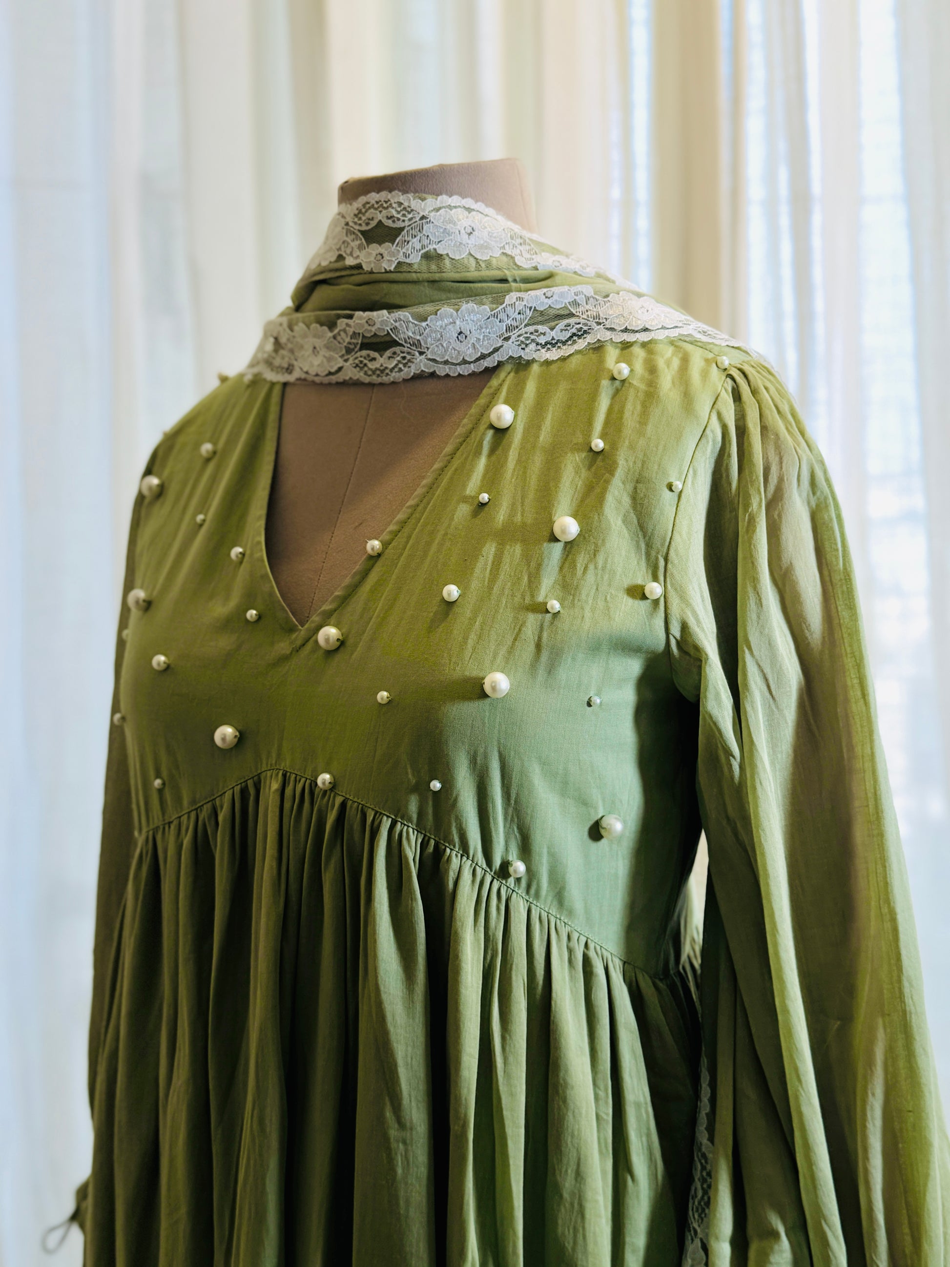 Elevate your wardrobe with this sophisticated green kurta set, featuring exquisite pearl embellishments and refined pleats that enhance its graceful silhouette. The accompanying lace-detailed dupatta adds an elegant finish, perfect for occasions where timeless style meets understated luxury.