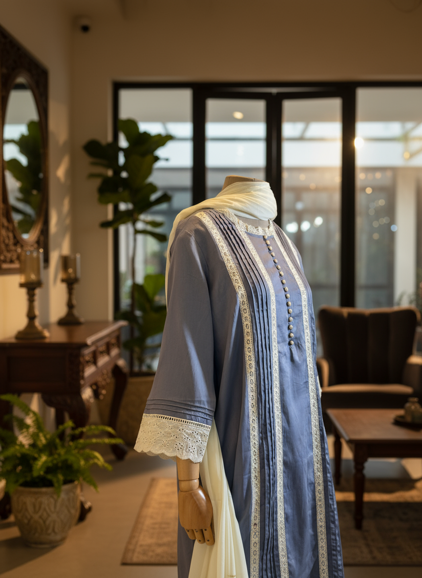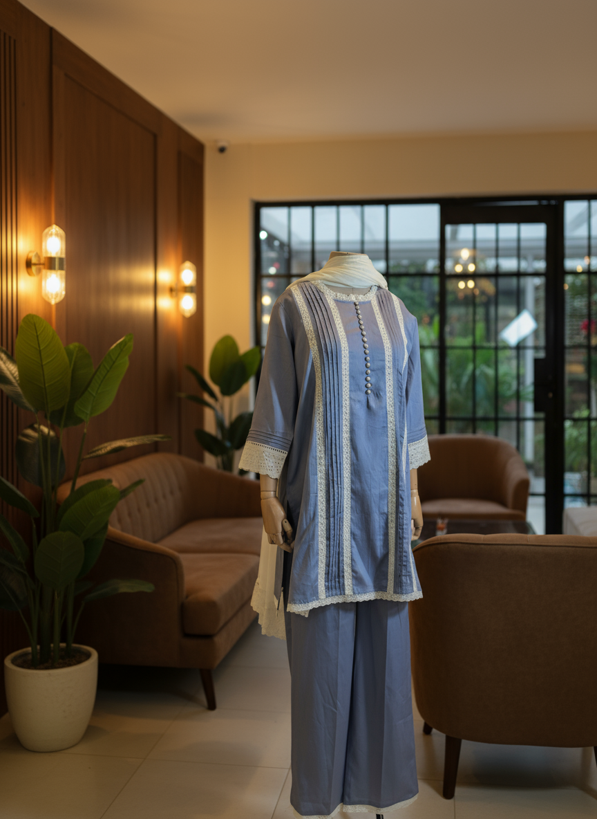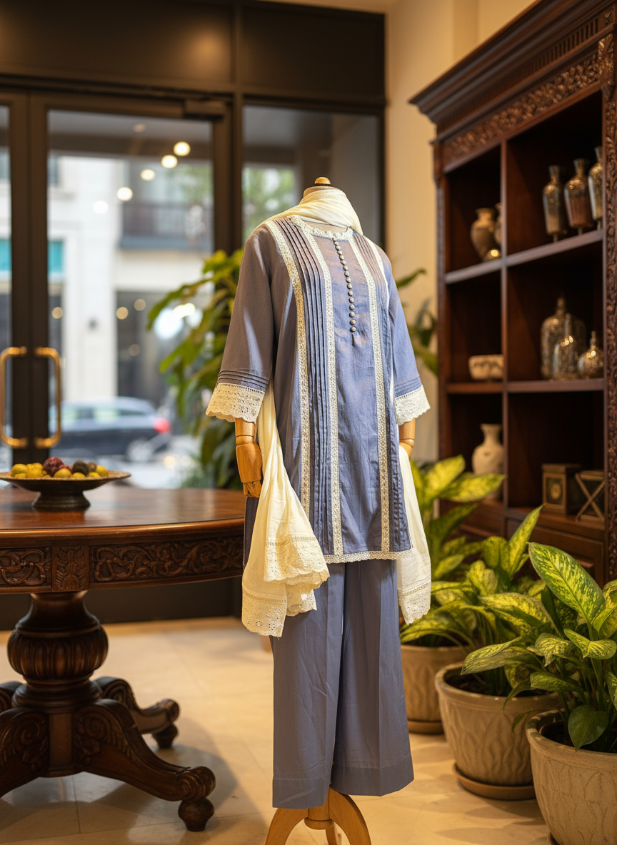 This grey kurta blends delicate lace detailing with charming pintucks for a textured, stylish look. Paired with a contrasting dupatta, it adds a pop of playful flair to your wardrobe. Perfect for those who love subtle elegance with a fun twist!